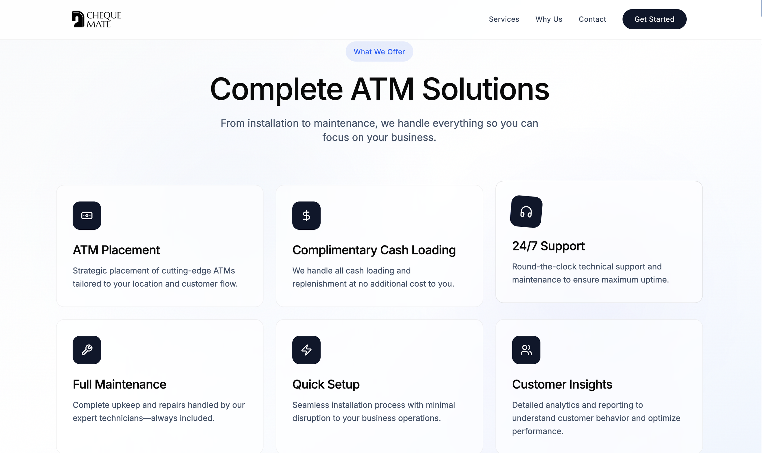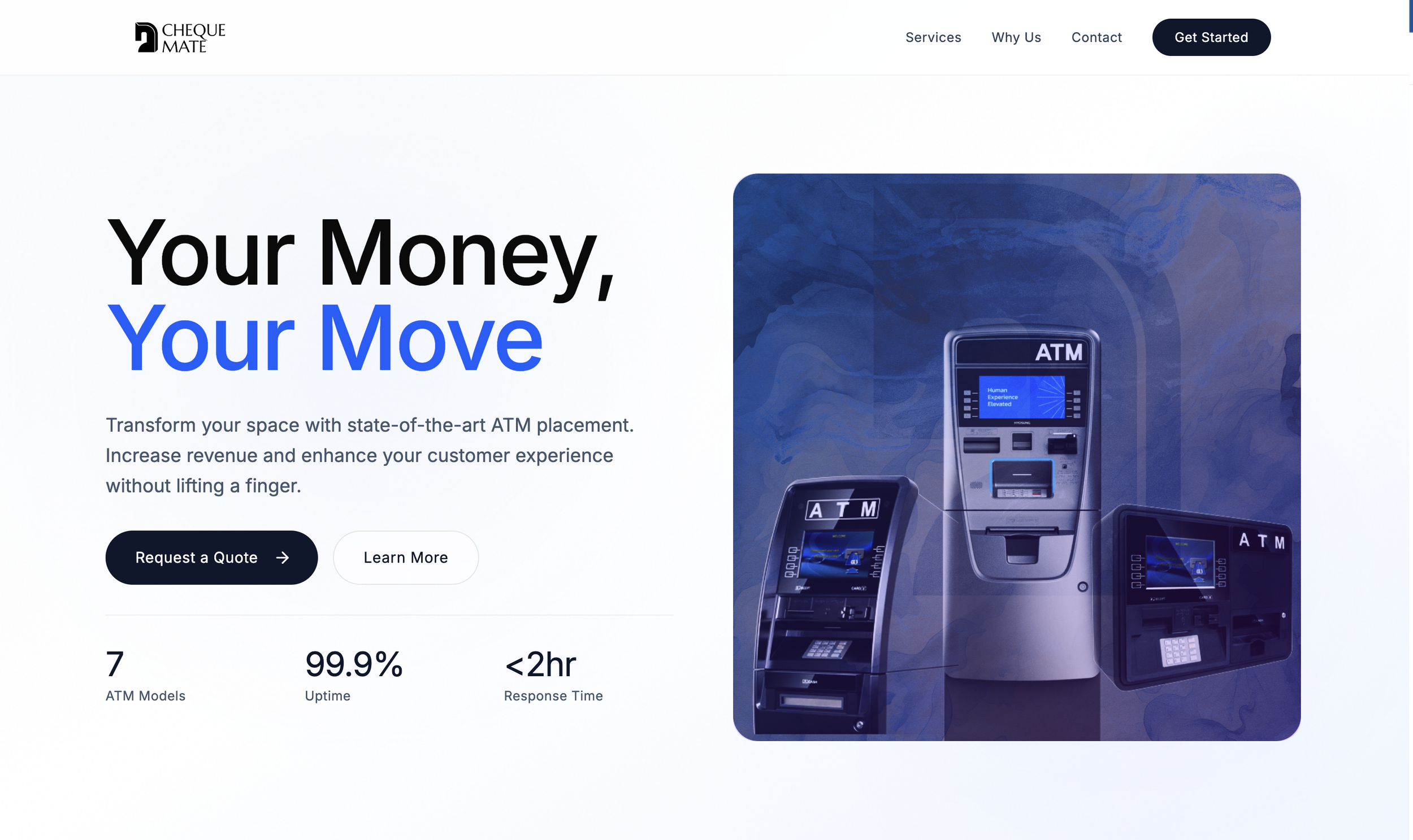 The ATM industry doesn't lend itself naturally to exciting design. The product is functional by definition, the category is largely invisible to consumers, and the businesses behind it rarely see branding as a priority. The challenge for Cheque Mate was to change that perception entirely, to create a visual identity and web presence that felt contemporary, confident, and worth paying attention to, without losing the cleanliness and professionalism a financial services client demands.